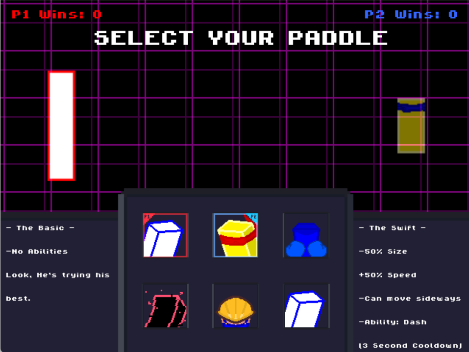 This game is a small pong project I made for a school assignment. Currently, there are five paddles to choose from, with each paddle having its own abilities and stats. This game requires 2 people to play.
